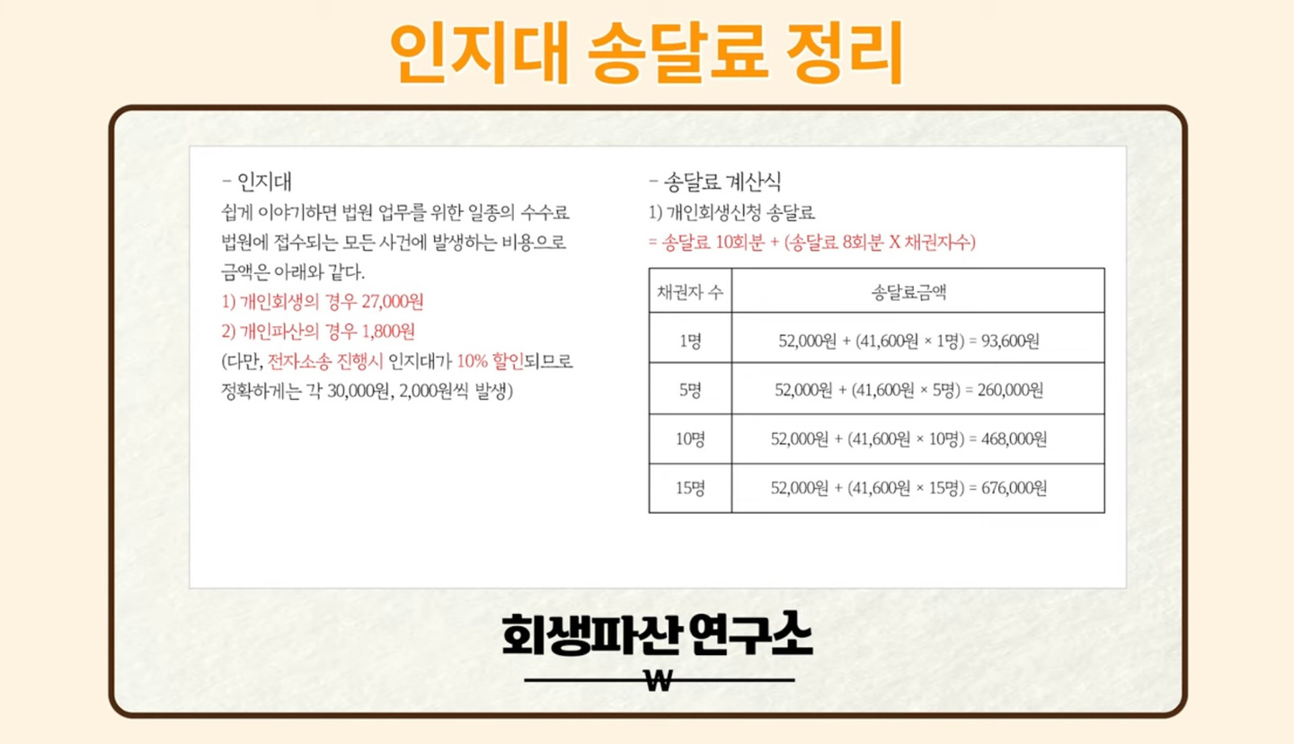 법원에 납부해야 하는 개인회생신청수수료는 크게 인지수수료와 배송료로 구성된다고 합니다. 개인회생개시 신청수수료는 30,000원입니다. 다만, 전자소송을 통해 신청할 경우에는 10% 할인된 27,000원을 납부하셔야 합니다. 배송비는 법원이 채권자에게 서류를 보내는 비용으로, 기본 배송비 10원과 채권자 수에 따라 추가 배송비로 구성됩니다. 현재 1회 배송료는 5,200원이며, 계산식은 ‘52,000원+(채권자수×5,200원×8)’이다. 예를 들어 채권자가 5명이면 총 배송료는 26만원이다. 더 자세히 알고 싶으시면 피드백을 받아보시기 바랍니다.