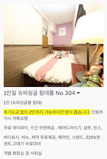 그래도 침구시트나 벽페인트 에어컨등의 시설은 깨끗하고 좋습니다.:) 창문이나 에어컨 틈새에 먼지도 없고.강박관념이 있어서 꼭 확인을 합니다.ㅜ 흐흐흐)